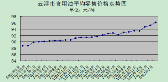 2月份,我市食用油市场供应充足,价格总体保持稳中有升。监测的9种食用油5L桶装零售均价每桶为96.20元,与上月环比升0.52%,与去年同期比升5.11%。