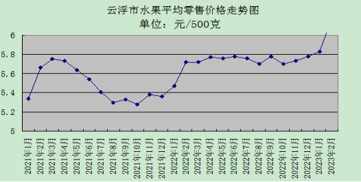 2月份,我市水果供应充足,价格微幅上涨,监测的6种主要水果零售均价每500克为6.17元,与上月环比升4.40%,与去年同期比升7.87%。