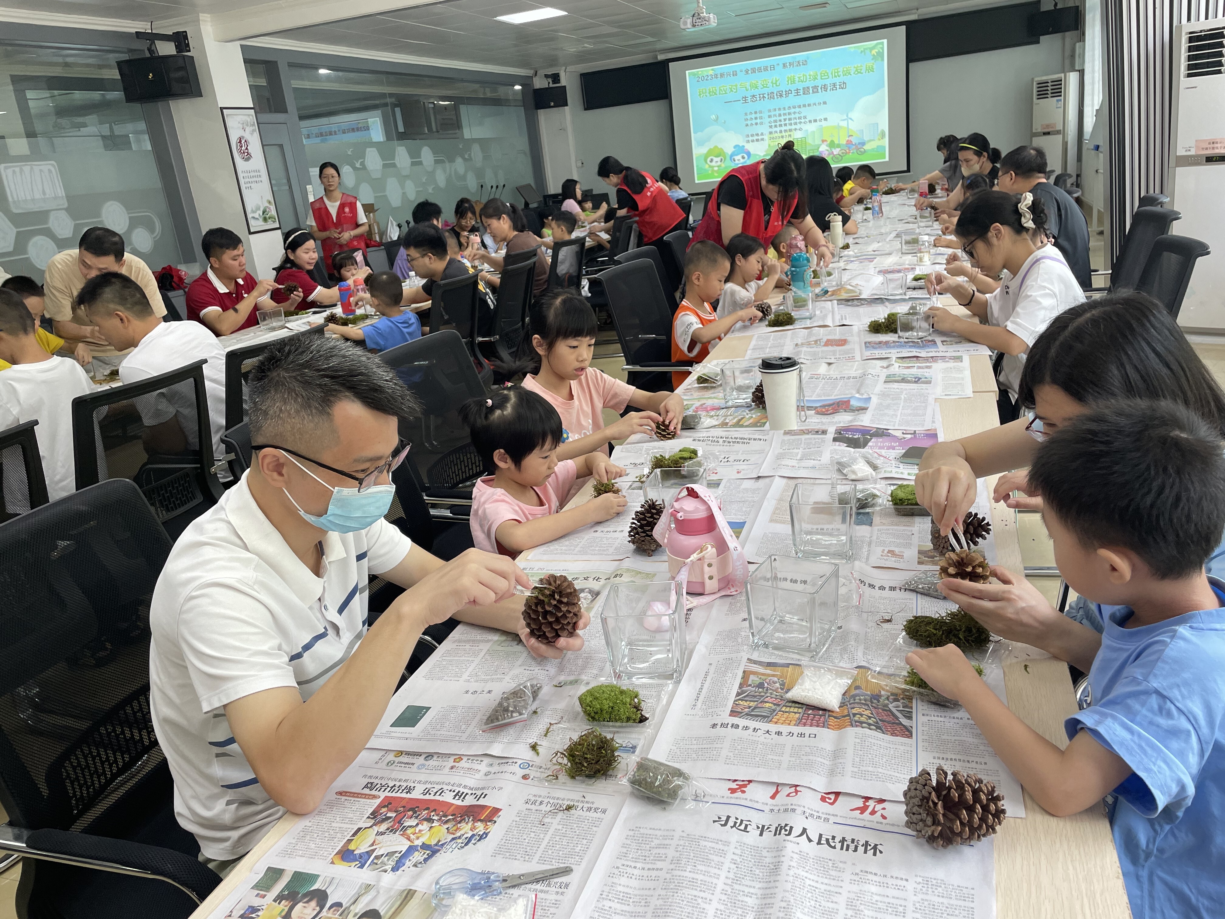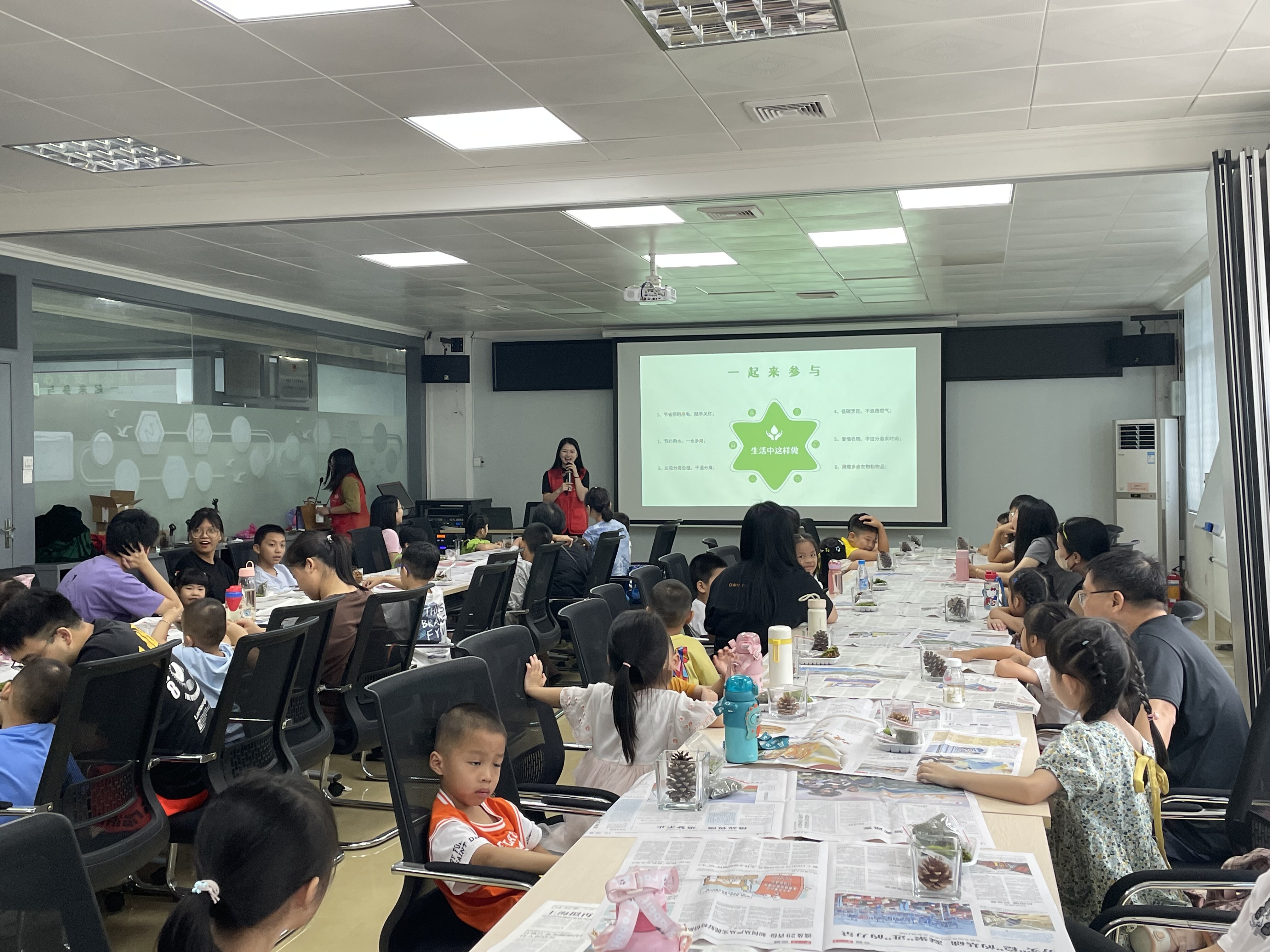 活动首先以讲座形式,志愿者通过PPT展示和生动有趣的语言为儿童与家长讲解低碳生活的相关知识,然后以创作松果苔藓绿植DIY盆栽的形式,提高小朋友对节能减碳的兴趣,增强宣传教育效果。