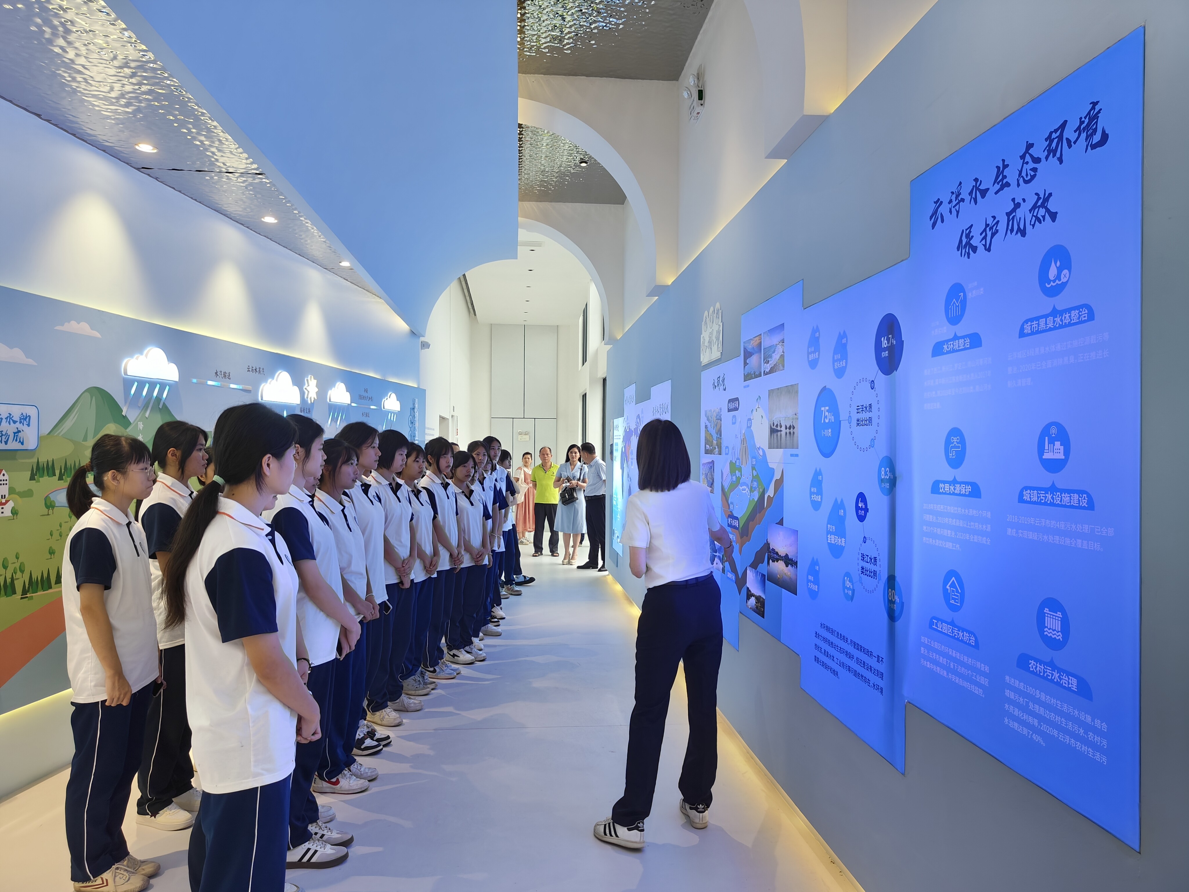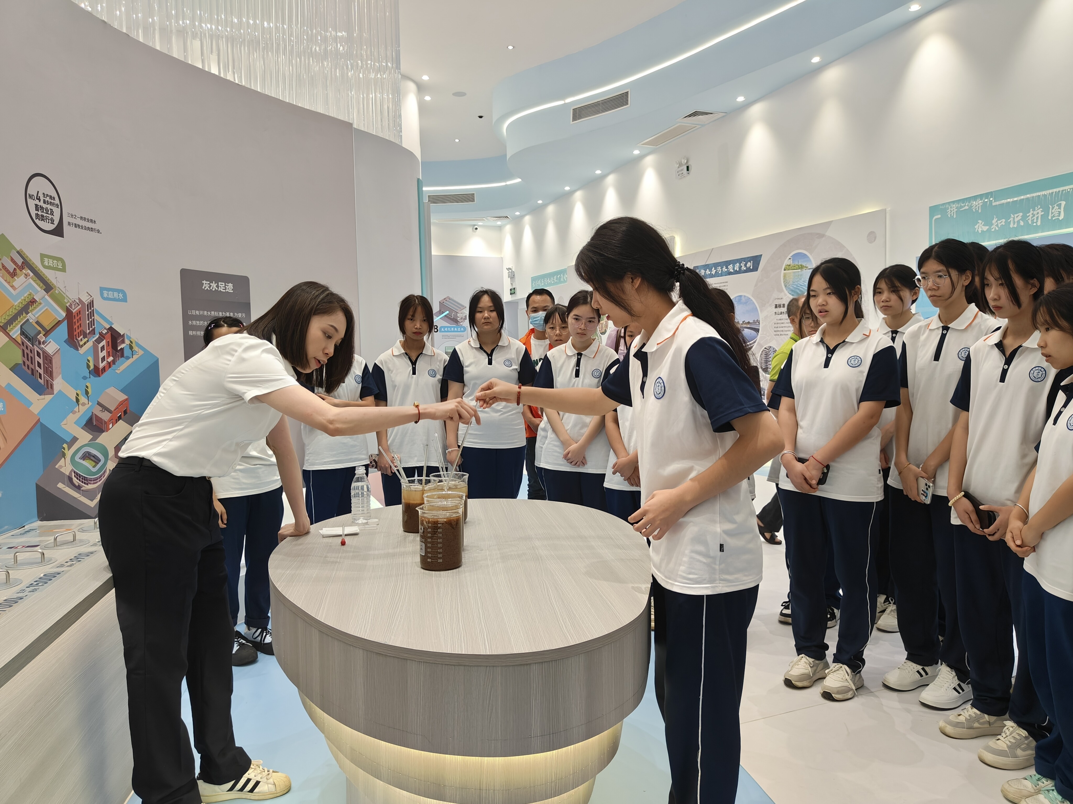 ▲图为学生在污水处理厂体验馆聆听讲解员讲解