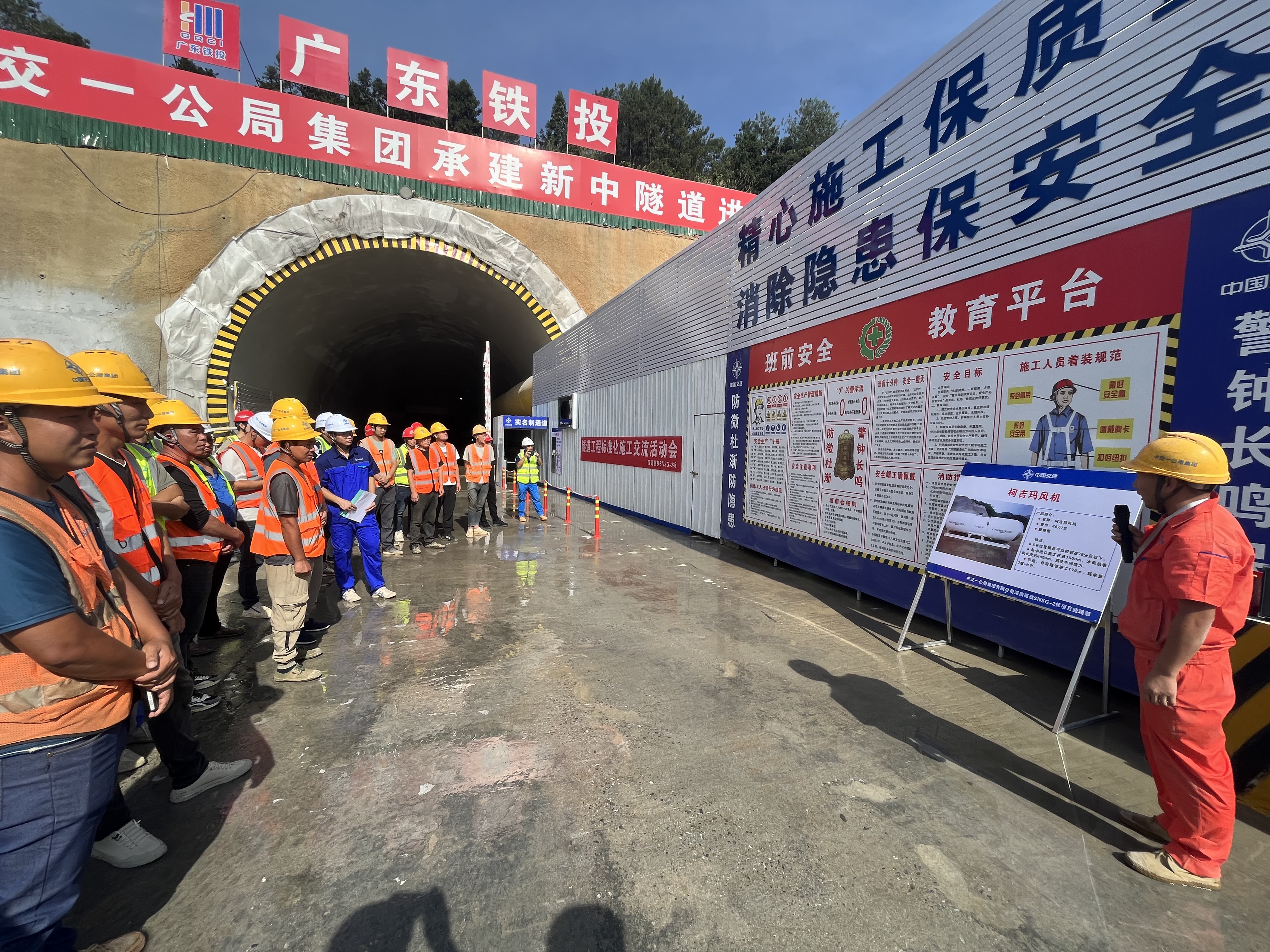 在新中隧道进口现场开展了隧道工程施工标准化交流活动,项目总工从开挖工法、隧道喷射混凝土、二衬施工、防排水、洞内文明施工、洞外设备布置等方面详细讲解了标准化施工流程,交流人员进行实地考察与交流学习,获取了丰富的现场资料。明确了隧道施工标准化的具体要求,为下一步标准化施工明确了方向。