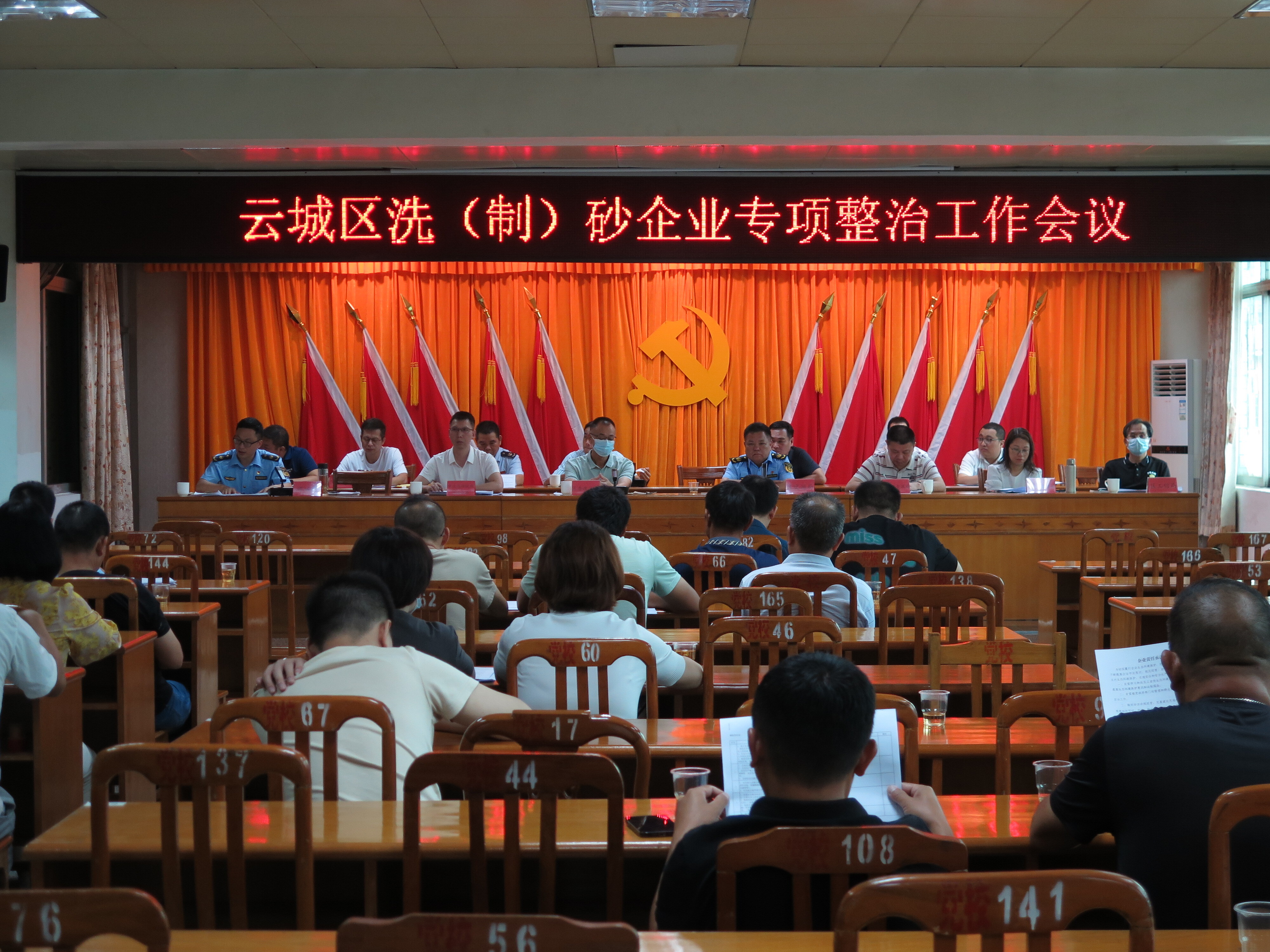 为全面贯彻习近平生态文明思想,牢固树立“绿水青山就是金山银山”的理念,切实做好我区洗(制)砂企业综合整治工作,推动洗(制)砂行业高质量发展,根据区委区政府有关洗(制)砂企业综合整治工作要求和《云城区洗(制)砂企业综合整治行动工作方案》的部署安排,2023年6月8日上午,我局组织有关部门在河口街道办召开洗(制)砂企业专项整治工作会议,对下阶段洗(制)砂企业的监管工作作强化部署。云城区委政法委、国家税务总局云浮市云城区税务局、云浮云城供电局、云城区工业和信息化局、云城区住房和城乡建设局、云城区农业农村和水务局、云城区应急管理局、云城区交通运输局、云城区城市管理和综合执法局、云城区市场监督管理局、云城区自然资源局、云浮市云城区河口街道办事处等部门有关负责人、河口街双上村一带的洗(制)砂负责人参加会议。