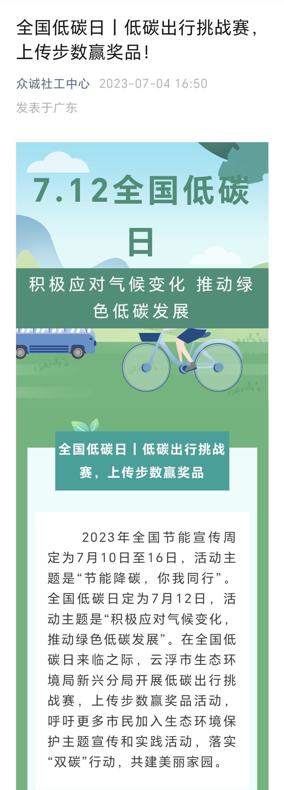 为倡导节能降碳和绿色发展理念,宣传节能降碳知识,引导广大群众积极响应绿色低碳的生活方式,7月4日到12日,云浮市生态环境局新兴分局开展以“积极应对气候变化,推动绿色低碳发展”为主题的2023年“全国低碳日”低碳出行挑战赛活动。