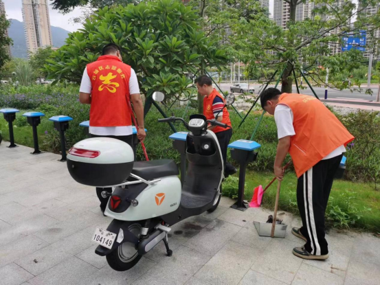 在翔顺筠粤豪苑网格点,志愿者们身穿红马甲,带上扫把、垃圾铲等清洁工具,按照环境卫生整治标准和要求把责任区的道路、花坛内、背街小巷的积存垃圾杂物清理干净,并对店外经营、非机动车乱停放及暴露垃圾、牛皮癣进行全面整治。他们用实际行动向广大市民宣传“门前三包”内容和相关政策法规,引导群众自觉履行好“门前三包”的义务,增强“主人翁”意识,维护好社区良好秩序,号召大家关注创文巩卫、参与创文巩卫、支持创文巩卫,倡导大家共创干净整洁、环境优美、生态宜居、文明和谐的美丽云浮。