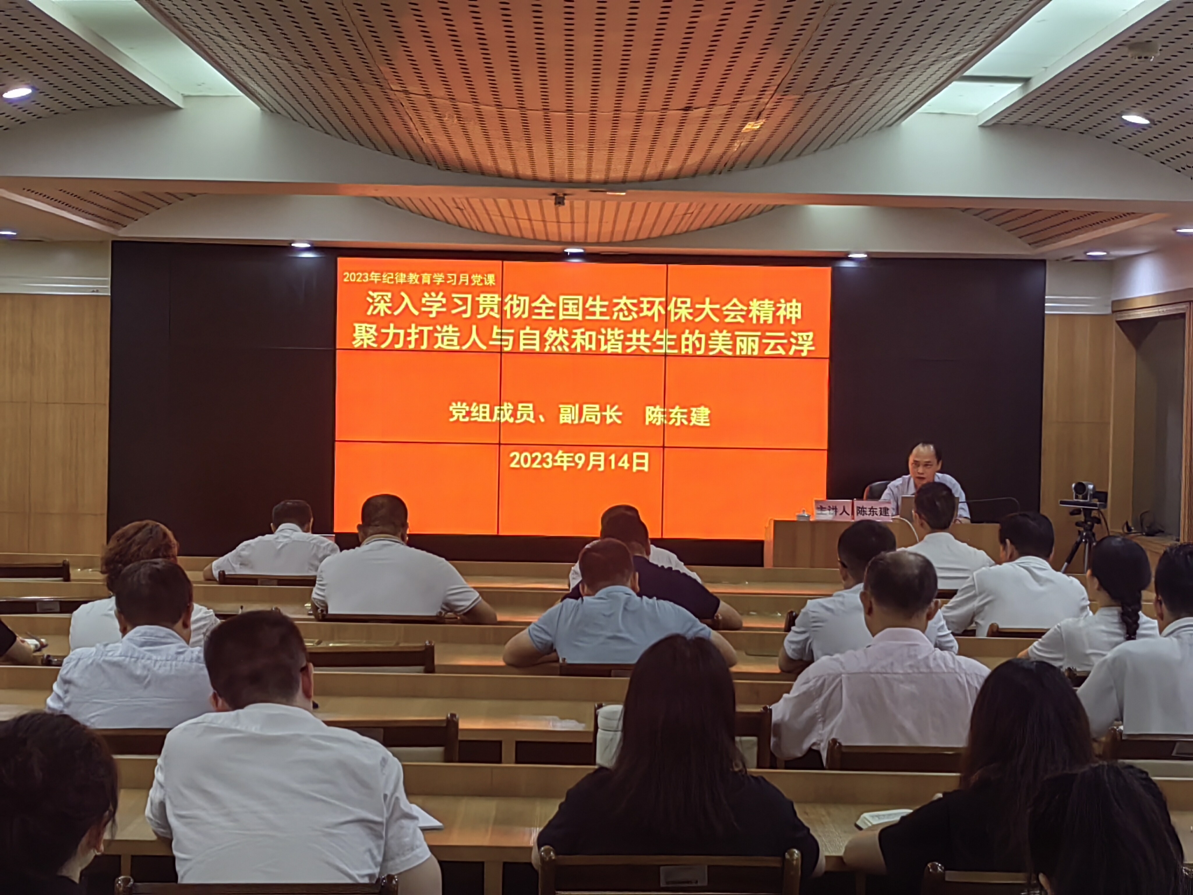 为深入开展2023年纪律教育学习月活动,9月14日下午,市生态环境局举办2023年纪律教育学习月活动辅导课,局党组成员、副局长陈东建以“深入学习贯彻生态环保大会精神,聚力打造人与自然和谐共生现代化的美丽云浮”为主题,为全体党员干部作专题辅导。