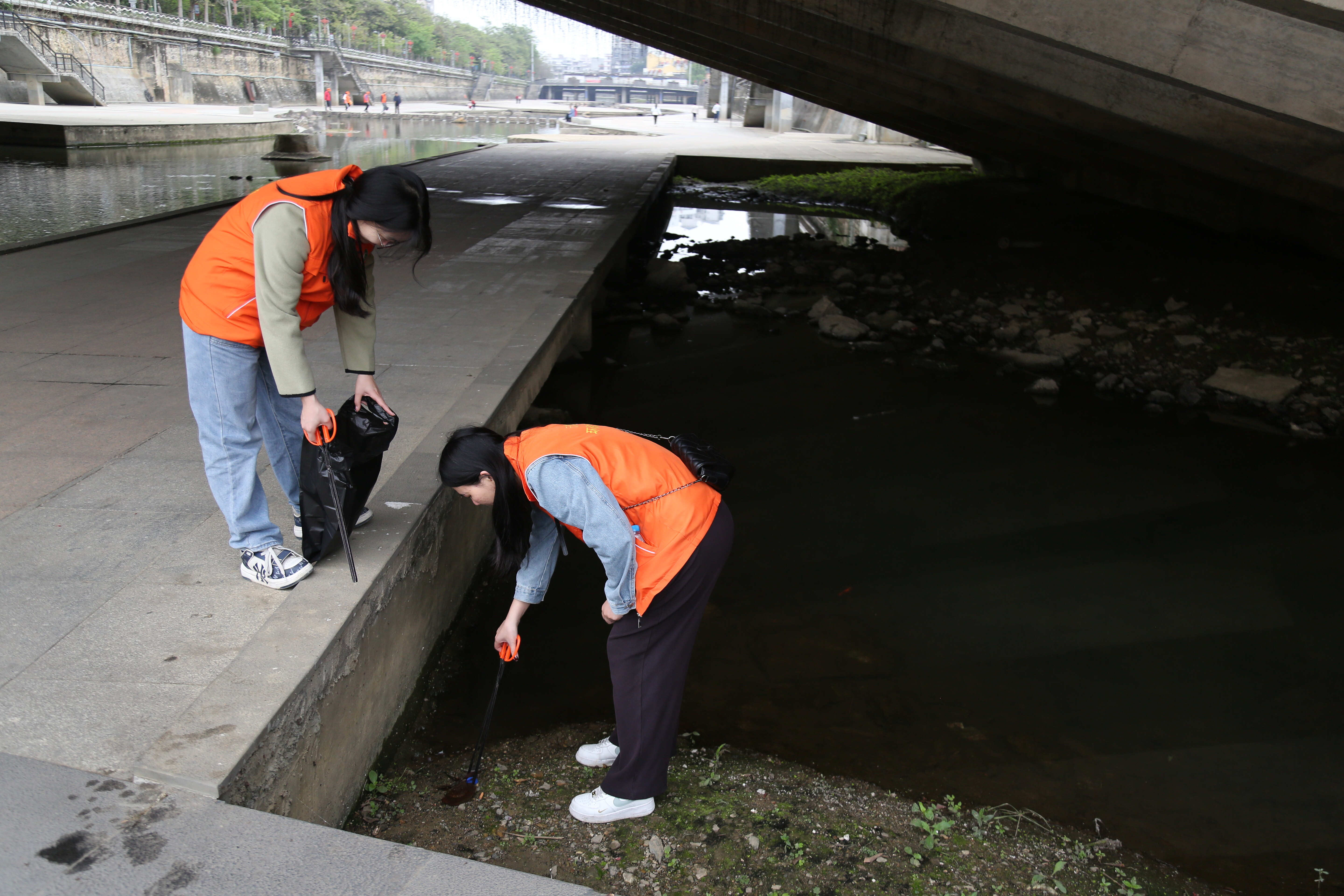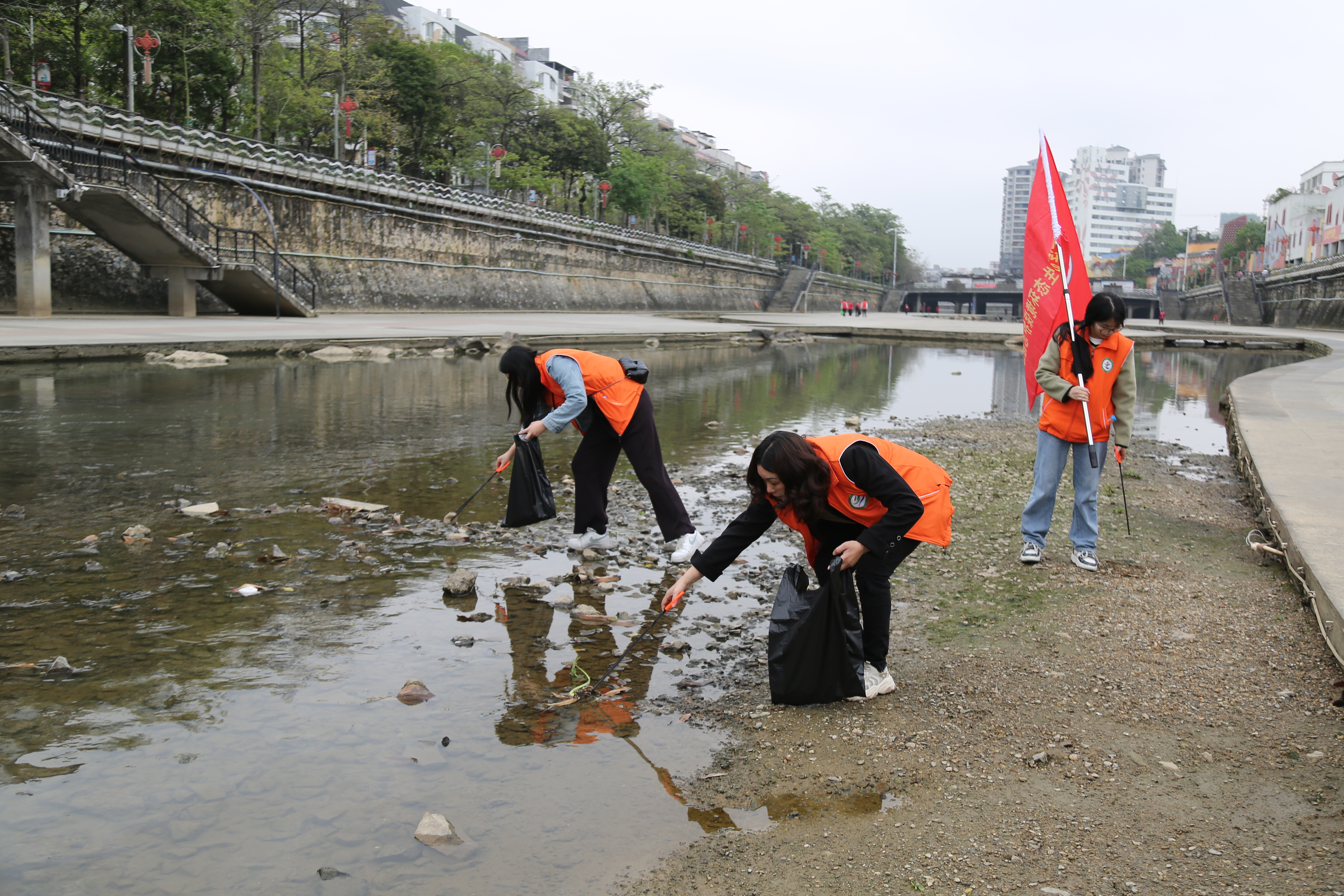 ▲图为环保志愿者清理河道垃圾