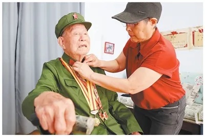 抗战老兵郄顺祥的女儿为郄顺祥整理衣服。梁子栋摄