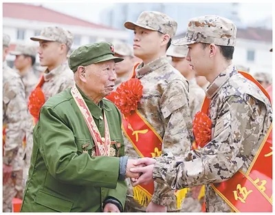 抗战老兵宣钜华勉励新兵扎根军营、建功立业。徐 伟摄