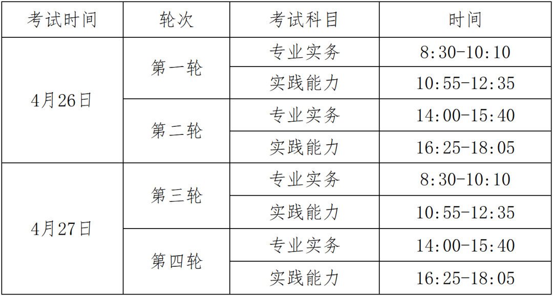 考试分为4轮次进行,每半天为一个轮次,考生将随机分配至其中一个轮次参加专业实务和实践能力两个科目的考试,具体考试时间以准考证为准。