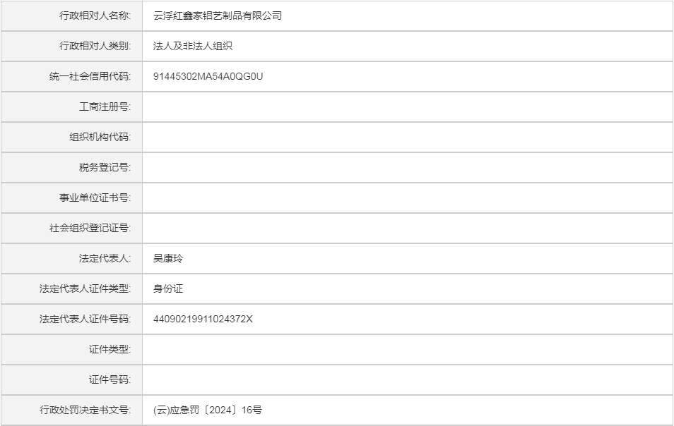 (云)应急罚〔2024〕16号云浮红鑫家铝艺制品有限公司行政处罚案