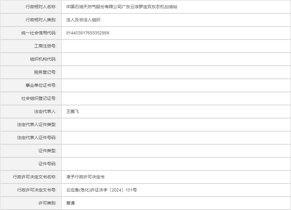 云应急(危化)许证决字〔2024〕151号中国石油天然气股份有限公司广东云浮罗定双东农机加油站危险化学品经营许可证(延期换证)