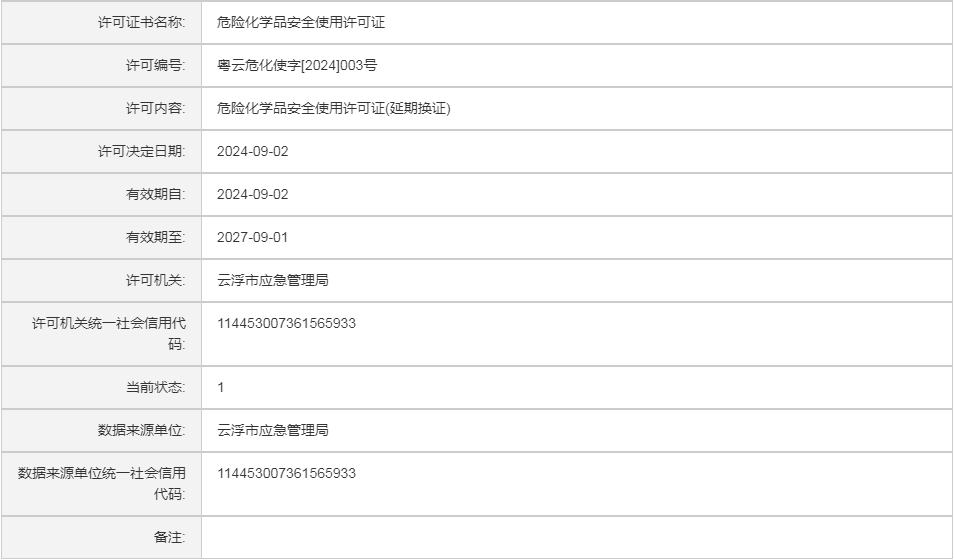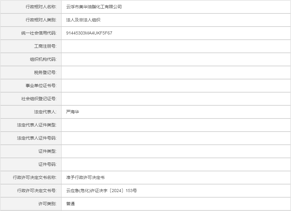 云应急(危化)许证决字〔2024〕153号云浮市美华油脂化工有限公司危险化学品安全使用许可证(延期换证)