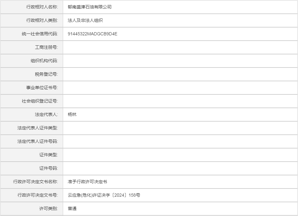 云应急(危化)许证决字〔2024〕158号郁南盛津石油有限公司危险化学品经营许可证(变更换证)