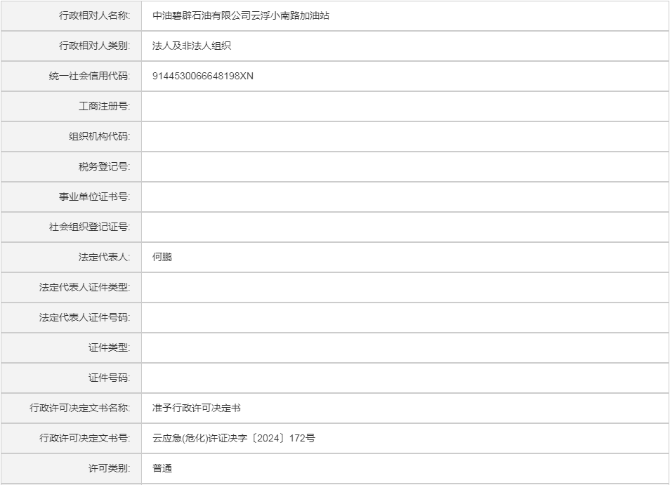 云应急(危化)许证决字〔2024〕172号中油碧辟石油有限公司云浮小南路加油站危险化学品经营许可证(变更换证)