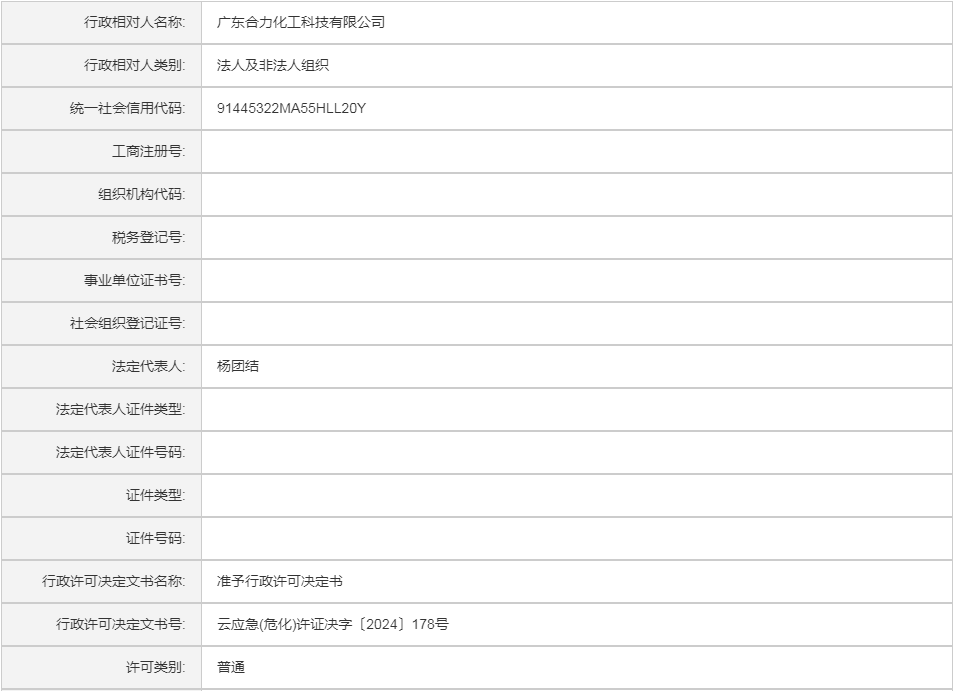 云应急(危化)许证决字〔2024〕178号广东合力化工科技有限公司危险化学品安全生产许可证(新领证)