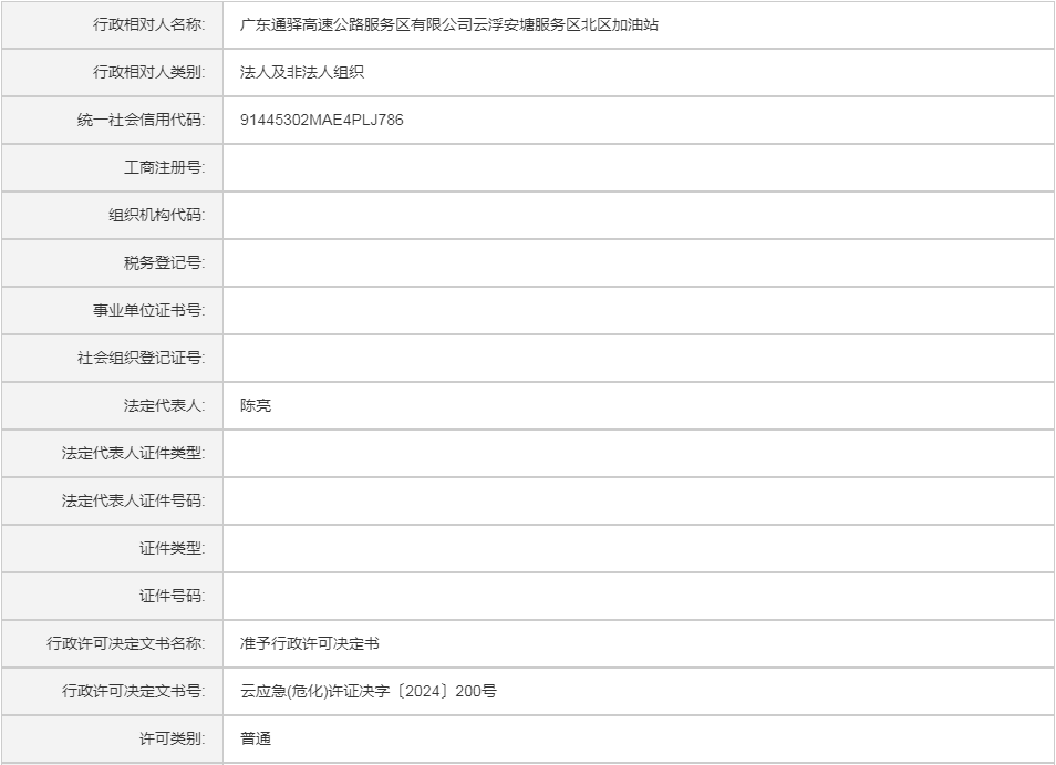 云应急(危化)许证决字〔2024〕200号广东通驿高速公路服务区有限公司云浮安塘服务区北区加油站危险化学品经营许可证(变更换证)