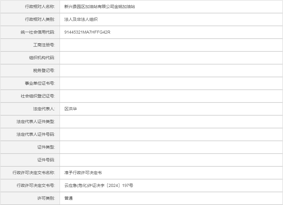 云应急(危化)许证决字〔2024〕197号新兴县园区加油站有限公司金铭加油站危险化学品经营许可证(新领证)