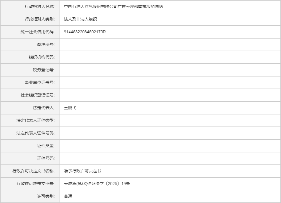 云应急(危化)许证决字〔2025〕19号中国石油天然气股份有限公司广东云浮郁南东坝加油站危险化学品经营许可证(延期换证)