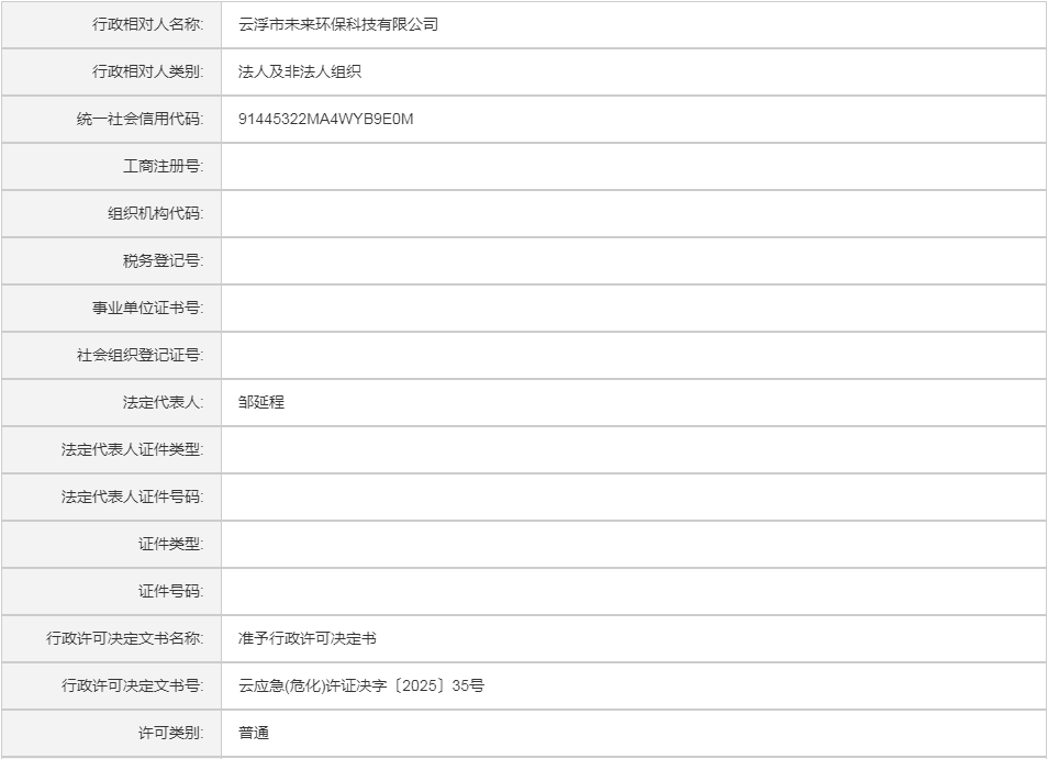 云应急(危化)许证决字〔2025〕35号云浮市未来环保科技有限公司危险化学品安全生产许可证(变更换证)