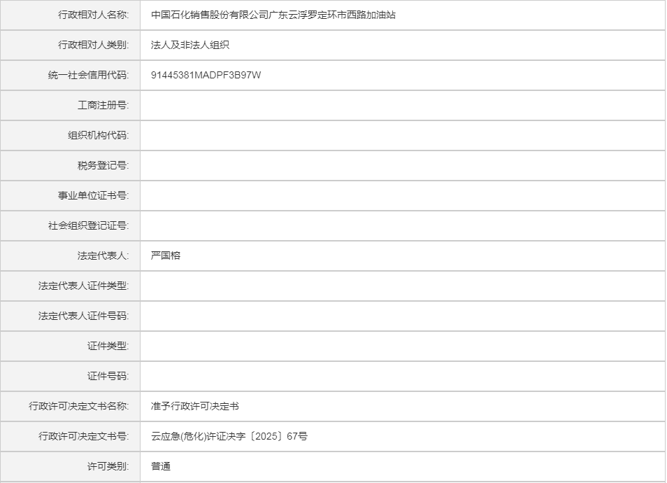 云应急(危化)许证决字〔2025〕67号中国石化销售股份有限公司广东云浮罗定环市西路加油站危险化学品经营许可证(新领证)