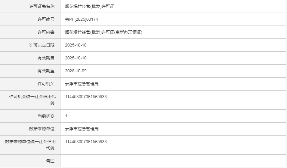 云应急(危化)许证决字〔2025〕73号云浮市云安区庆兆烟花炮竹有限公司烟花爆竹经营(批发)许可证(重新办理领证)