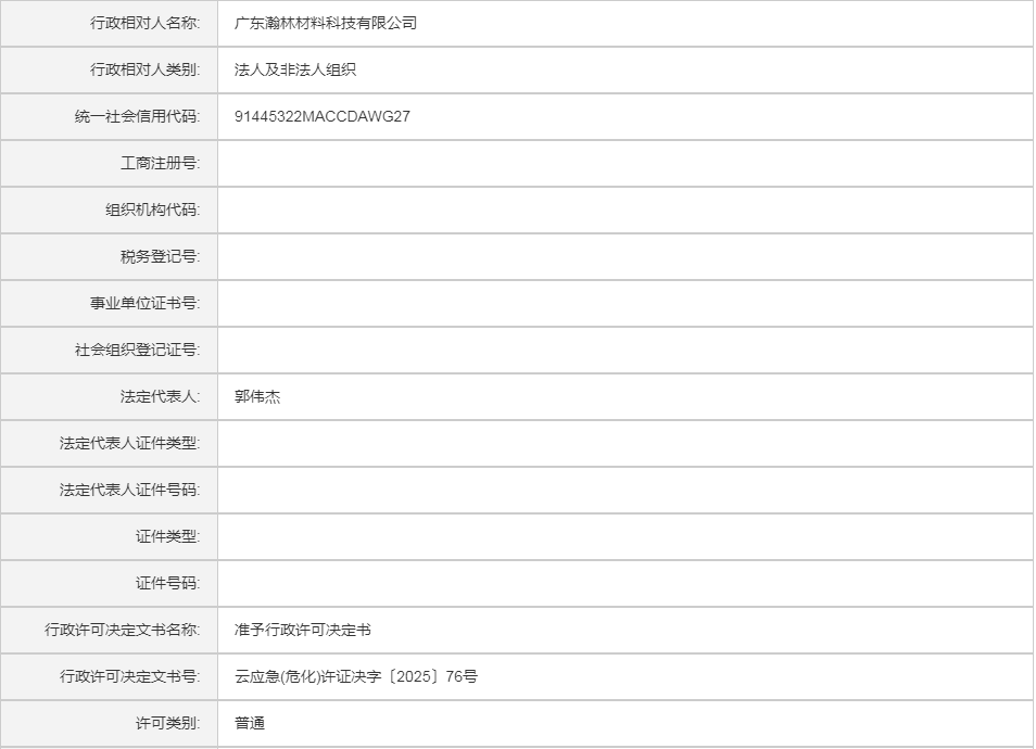 云应急(危化)许证决字〔2025〕76号广东瀚林材料科技有限公司危险化学品安全生产许可证(新领证)