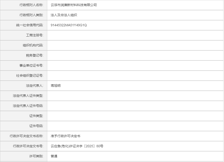 云应急(危化)许证决字〔2025〕80号云浮市润澳新材料科技有限公司危险化学品建设项目安全设施设计审查意见书