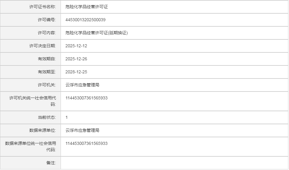 云应急(危化)许证决字〔2026〕2号云浮市鑫隆汇环保新材料有限公司危险化学品安全生产许可证(延期换证)