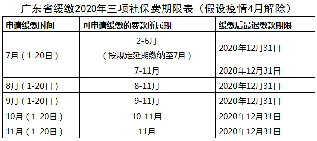 所属期2020年2月起至疫情解除后第二个月的三项社保费,缴款期限允许延长至疫情解除后第三个月;2020年1月23日广东省启动重大突发公共卫生事件一级响应后,用人单位未及时申报缴纳所属期2020年1月三项社保费的,一并延长缴款期限至疫情解除后第三个月。假设疫情4月解除,则所属期2-6月的三项社保费缴款期限统一延长至7月,用人单位应于7月底前缴清所属期2-7月的三项社保费。