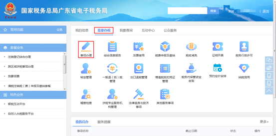 (1)选择【我要办税】—【事项办理】,进入事项办理模块。