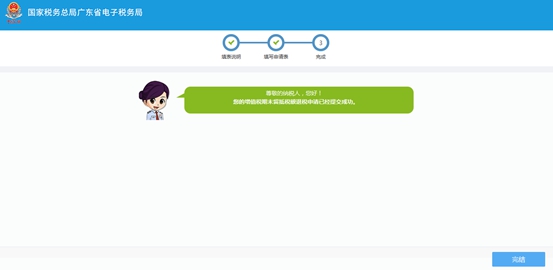 (4)成功提交事项申请后,系统会出现成功提示的页面,点击【完结】可关闭页面。