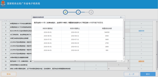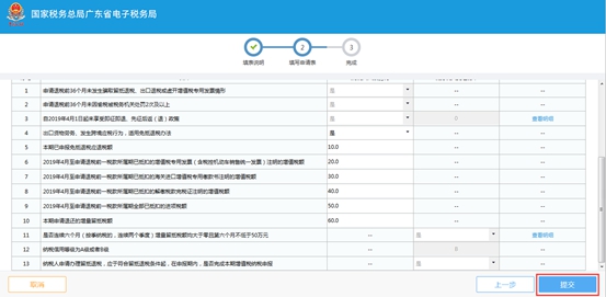 (3)若纳税人没有申请记录,则根据实际情况填写数据。若填写数据不符合业务规则,系统弹出对应提示,纳税人可根据提示判断填写是否有误,若有误,则根据提示信息修改填写内容,若无法修改,则说明不符合申请条件。正确填写完成后,点击【提交】按钮可完成事项申请。