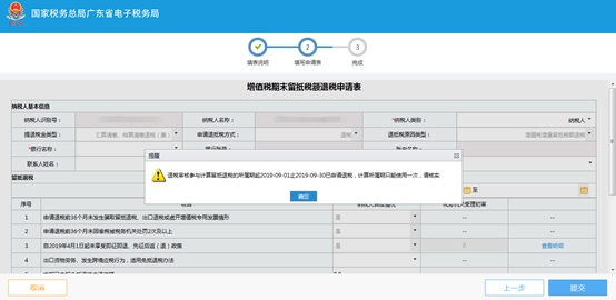 (2)在信息填写页面中,系统会监控纳税人在该属期内是否申请过退税,若已申请,系统弹出对应提示,不允许纳税人再次申请;