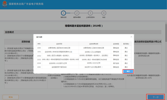 (1)初始化弹出信息监控窗口,若通过监控,点击【确定】关闭监控页面,页面展示“业务概述”及“政策依据”,点击【下一步】进入信息填写页面;若有任一强制监控不通过,则无法继续申请