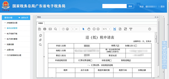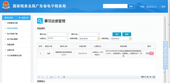 若税务机关完成终审,系统返回批复通知书,纳税人在点击【签收】按钮签收该文件,确认是否终审通过,终审通过返回的文书为准予退还通知书,终审不通过返回的文书为不予退还通知书。