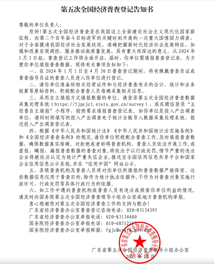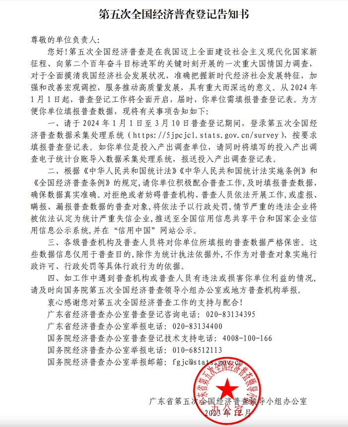 第五次全国经济普查登记告知书(面向一套表单位)