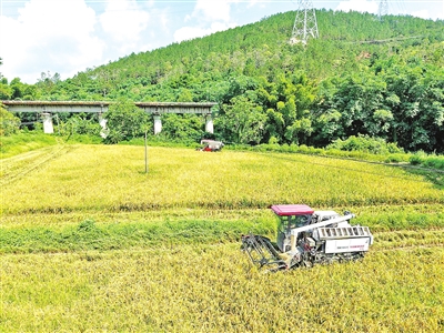 本报讯 (云浮融媒记者 黄洋 通讯员 雷程 何咏琪) 近日,新兴县河头镇“河头香米”种植基地迎来早造水稻丰收季,百亩优质稻田全面收割。记者在河头镇湾中村委小洞村看到,3台收割机开足马力来回穿梭于金黄稻田间,正争分夺秒收割今年的第一批香米(如图)。