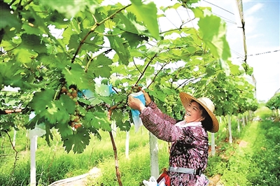 凤塘村种植基地工作人员正为葡萄进行套袋作业